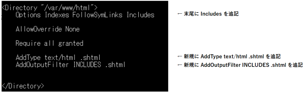 サイトのルートに SSI を有効化するため、/etc/httpd/conf/httpd.conf の ブロックを2箇所編集します。