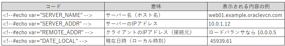 上記それぞれの <!–#echo var=”~” –> は、「サーバが持っている環境変数をページ内に表示せよ」という意味になります。