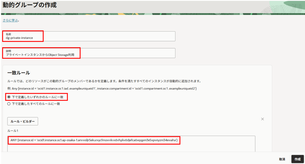 ルール・ビルダー:ANY {instance.id = ‘該当インスタンスのOCID’}