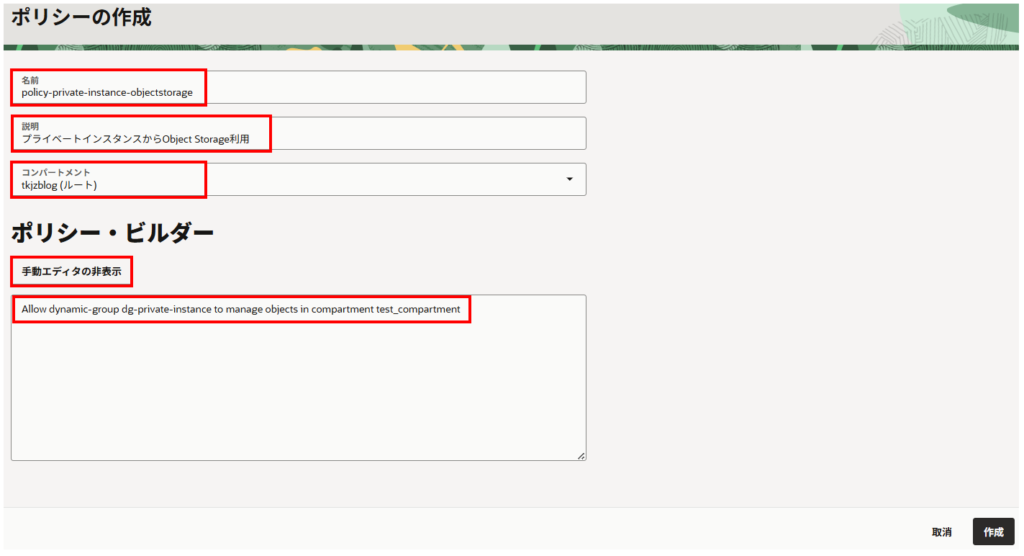 作成した動的グループのリソース(今回はインスタンス)がバケット(Object Storage)へアクセスできるようポリシーを作成します。