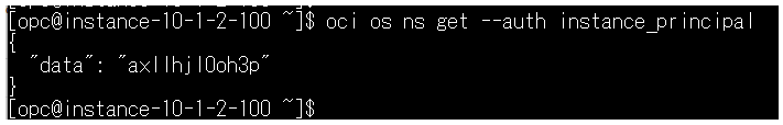 コマンド例:oci os object list -bn バケット名 –auth instance_principal