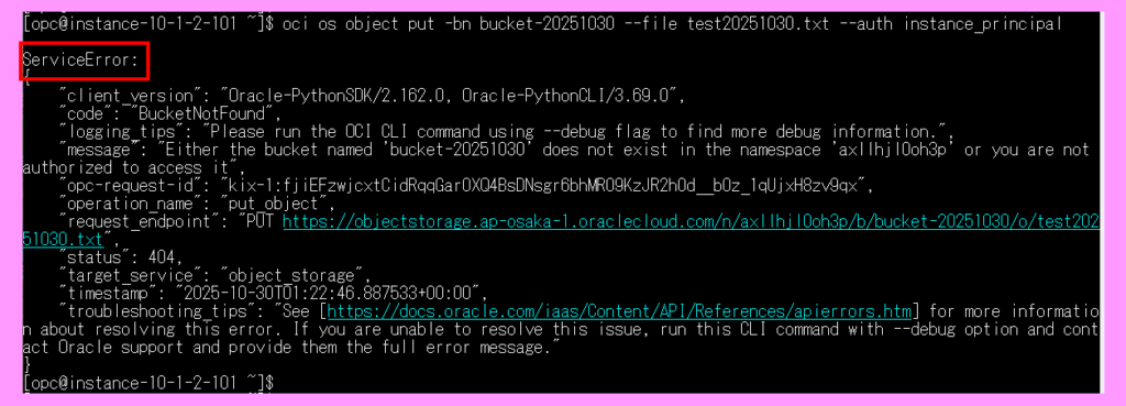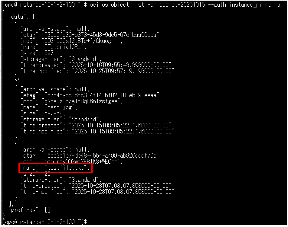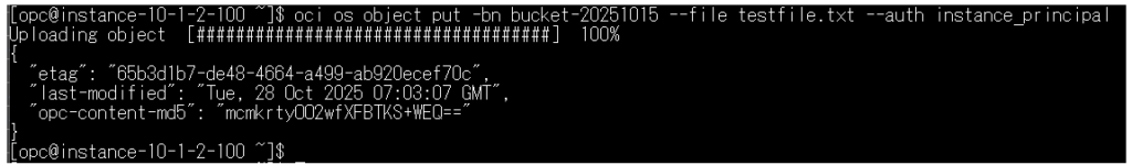 oci os object put -bn bucket-20251015 –file testfile.txt –auth instance_principal