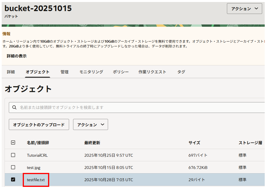 次に以下コマンドを実行し、OCIバケットにある「testfile.txt」を別名「downloaded.txt」としてダウンロードします。