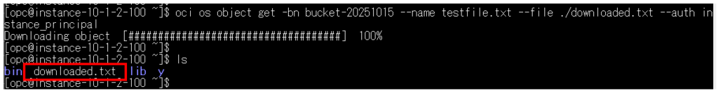 コマンド例:oci os object get -bn バケット名 –name testfile.txt –file ./downloaded.txt –auth instance_principal