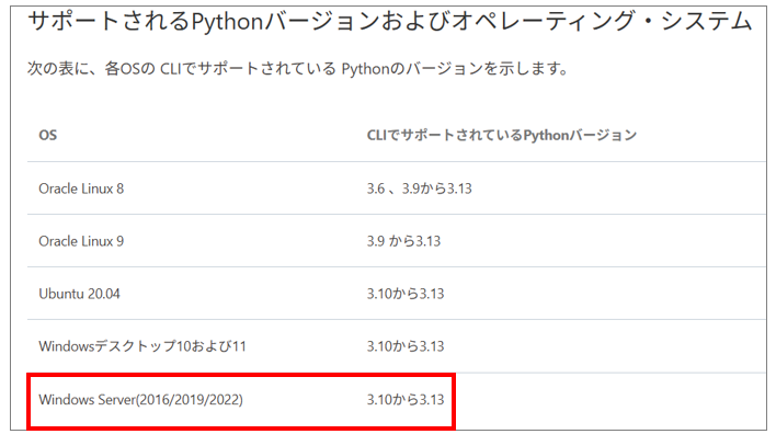以下参考URLの「サポートされているバージョンのPython」のリンクから、WindowsサーバでサポートされているバージョンのPythonを確認します。