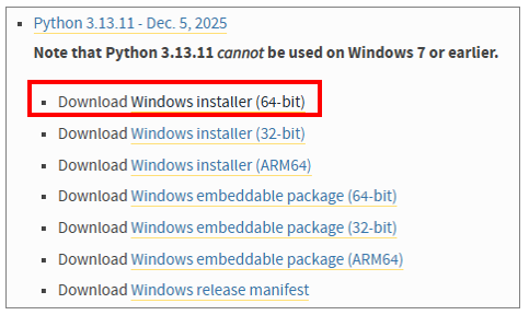 上記で確認したサポートされているバージョンである「3.13.11」のWindows installer (64-bit) を選択します。