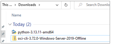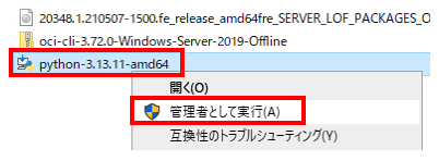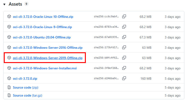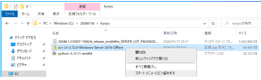 Windows Server 2022 用はないのですが、Chatgptに聞くと2019でよいとのことでしたので「oci-cli-3.72.0-Windows-Server-2019-Offline.zip」をダウンロードします。