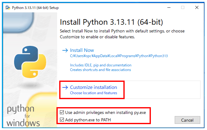 赤枠内の2か所にチェックを入れて、「Customize installation」をクリックします。