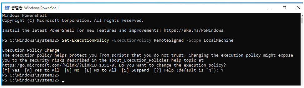 Set-ExecutionPolicy -ExecutionPolicy RemoteSigned -Scope LocalMachine