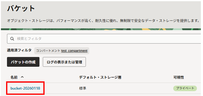 自分で作成したバケット名を確認します。(例:bucket-20260118)