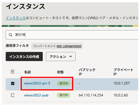 適用済フィルタでコンパートメントを指定し、該当インスタンスをクリックします。