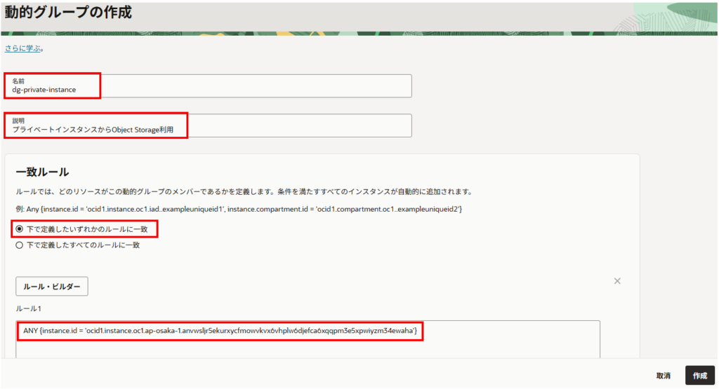 ルール・ビルダー:ANY {instance.id = ‘該当インスタンスのOCID’}