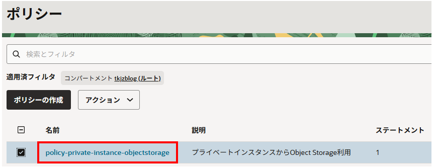 作成した動的グループのリソース(今回はインスタンス)がバケット(Object Storage)へアクセスできるようポリシーを作成します。