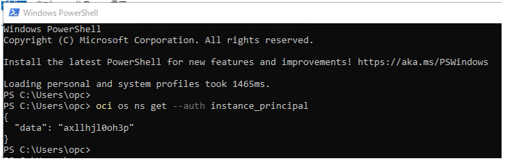 oci os ns get --auth instance_principal
