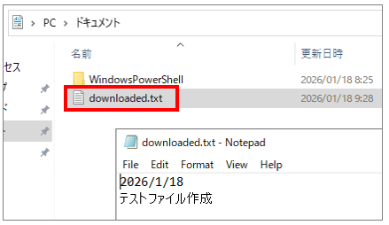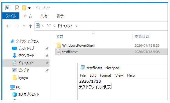 先ほど作成した testfile.txt が保存されているフォルダへ移動します。