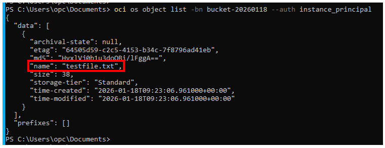 oci os object list -bn bucket-20260118 --auth instance_principal
