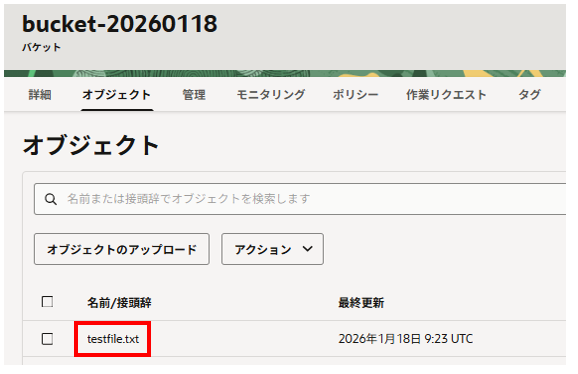 OCIコンソールでもアップロードされていることが確認できました。