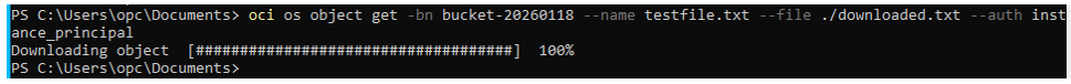 oci os object get -bn bucket-20260118 --name testfile.txt --file ./downloaded.txt --auth instance_principal