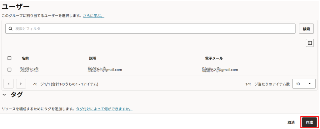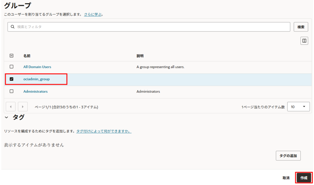 グループの選択画面でユーザー「ocitestadm01」は、「ociadmin_group」に所属させたいのでチェックを入れて、右下の「作成」をクリックします。