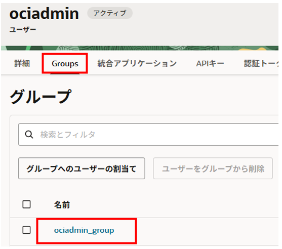 ユーザー名「ocitestadm01」をクリック、「Groups」タブを選択すると所属するグループ「ociadmin_group」が表示されます。