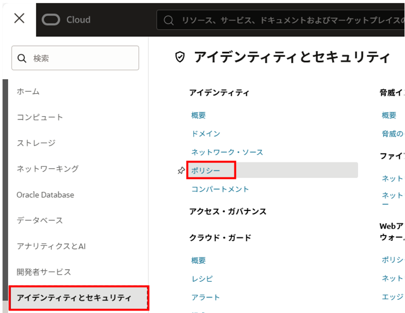 OCIコンソールの左上のハンバーガーメニューを展開し、「アイデンティティとセキュリティ」を選択、「アイデンティティ」の「ポリシー」を選択します。