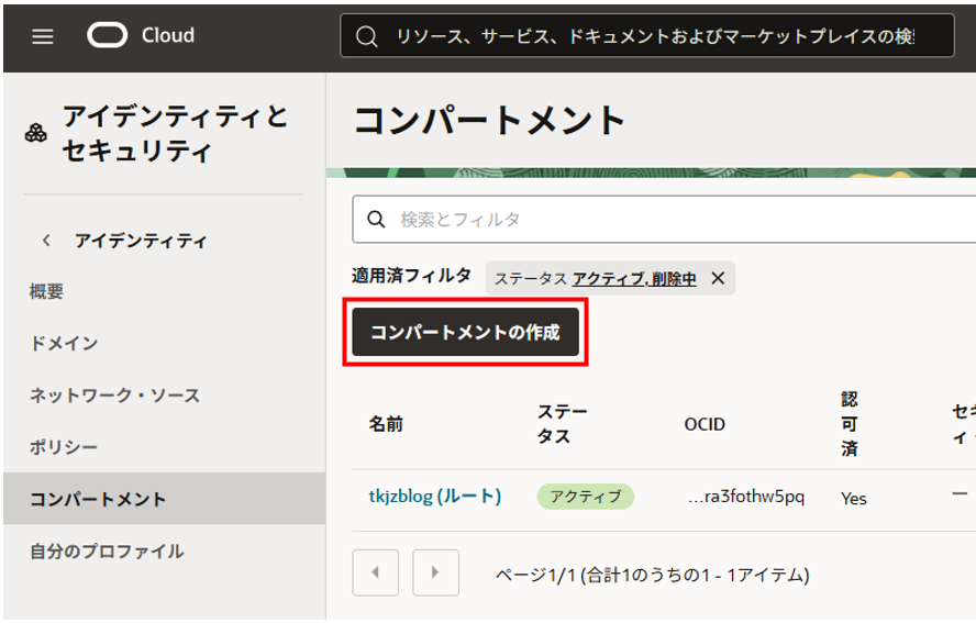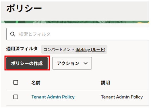 さらにグループ、ポリシー、コンパートメントを新規作成し、今後の検証作業は管理者ユーザーで作成したコンパートメントへコンポーネントを作成して進めたいと思います。