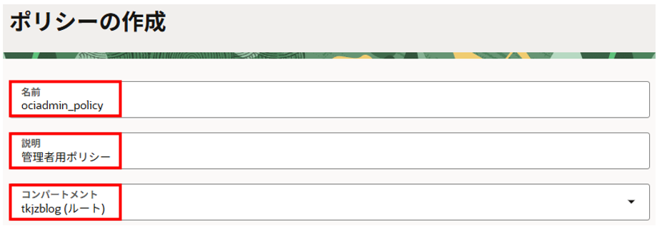 新規管理者ユーザー「ocitestadm01」が所属するグループ「ociadmin_group」へ適用するポリシー「ociadmin_policy」を作成して、グループへ作成したポリシーを適用します。