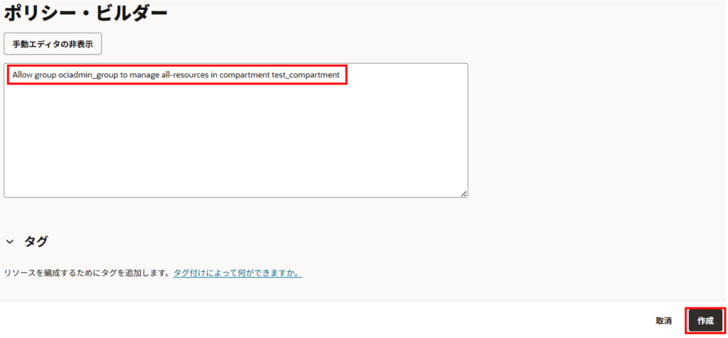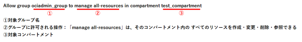 管理者ポリシー「ociadmin_policy」の内容は、「test_compartment」コンパートメント内の全リソースに対して、管理者グループ「ociadmin_gropu」 のメンバーはフル権限を持つというものです。