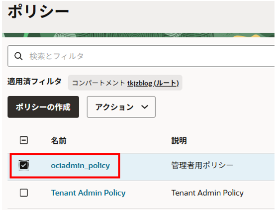 管理者用ポリシー「ociadmin_policy」が作成されました。