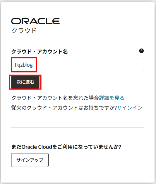 「クラウド・アカウント名」を入力して「次に進む」をクリックします。