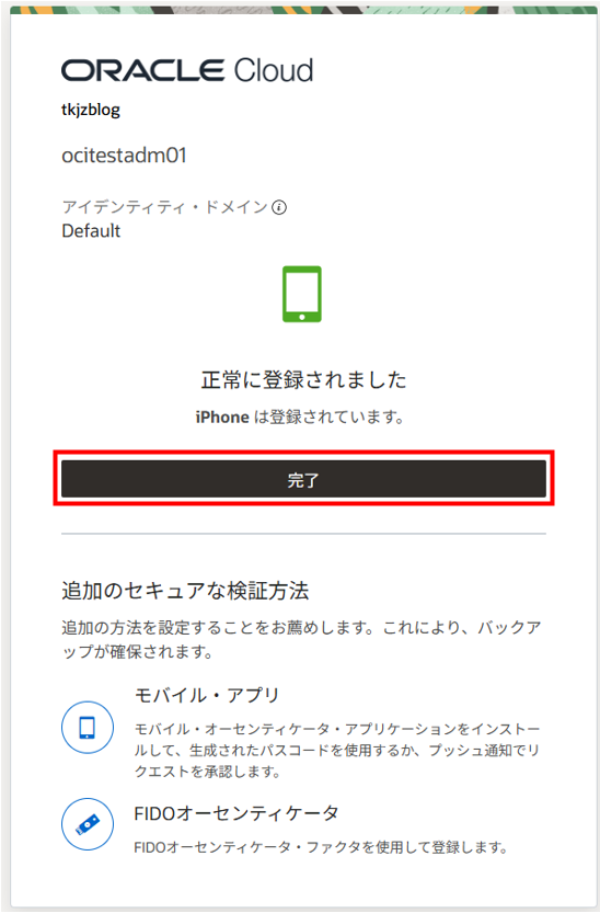 Oracle Mobile Authenticatorアプリケーションで読み込むとブラウザ側は「完了」となるので「完了」をクリックします。