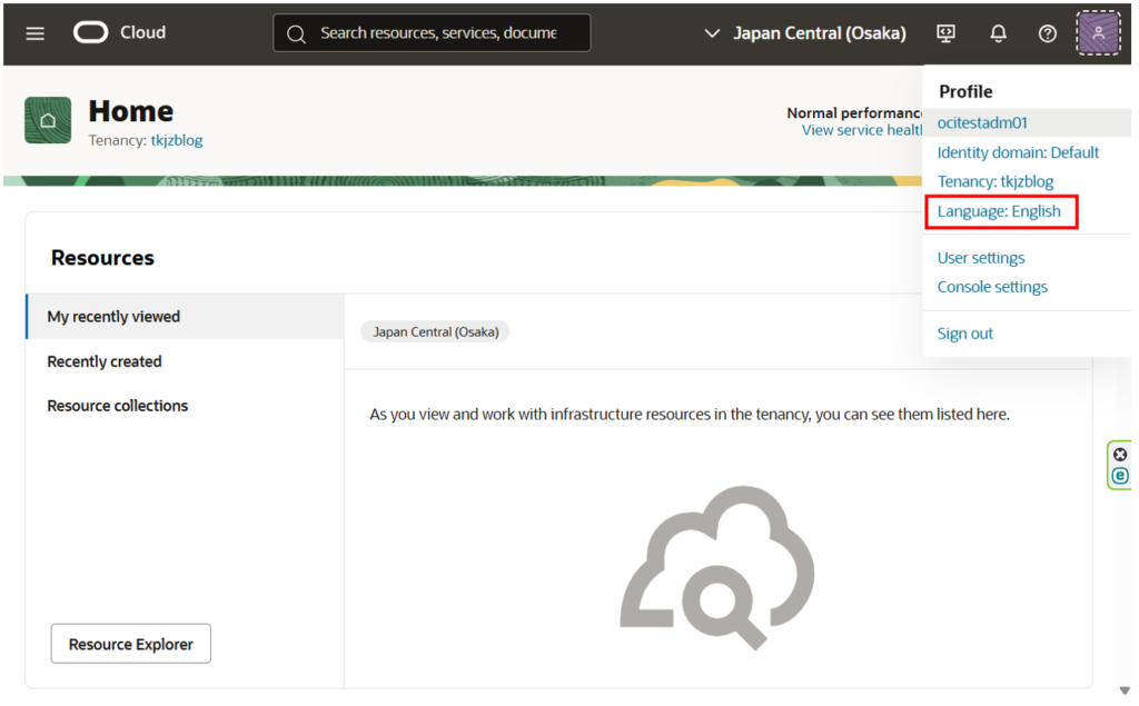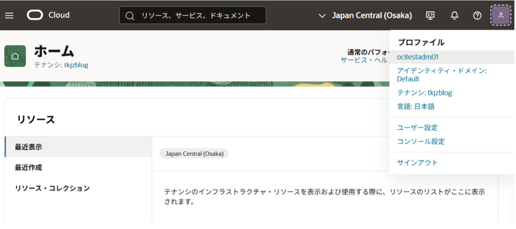 OCI管理コンソールへサインインできました!!やっぱり英語表記なんですね。日本語表記に変更しておきます。
