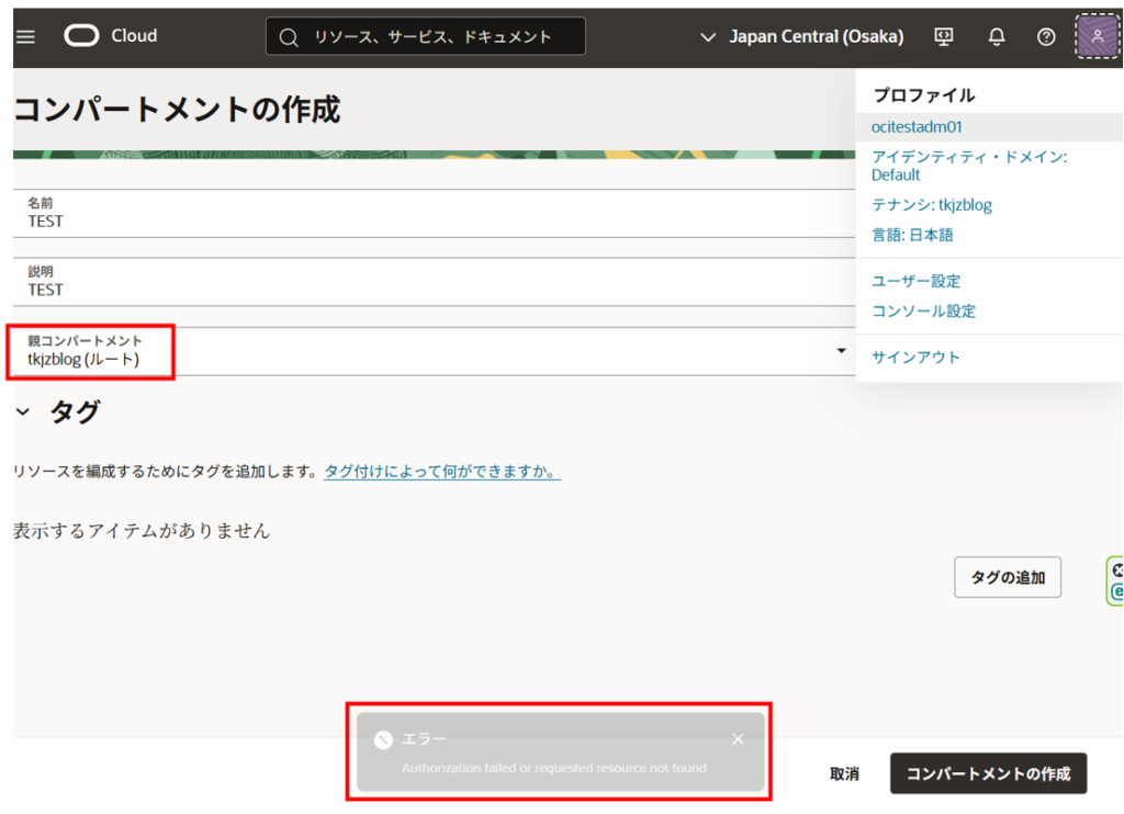 ●「test_compartment」コンパートメント内に新規コンパートメント「TEST」の作成を試みる ⇒ 成功するはず