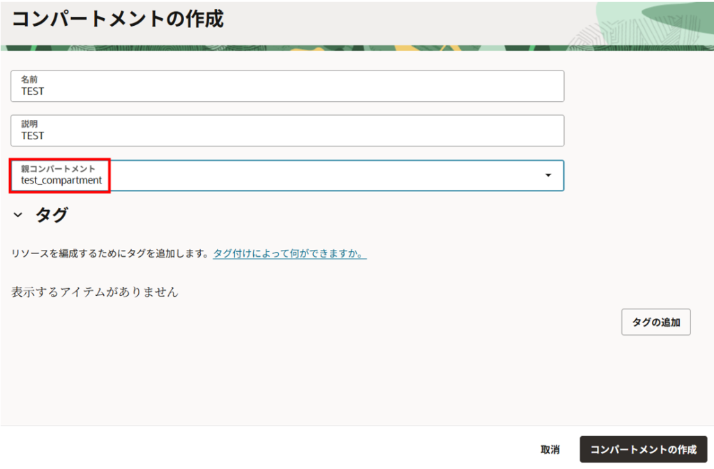 次に、以下のとおり「親コンパートメント」に自身が権限のある「test_compartment」を指定して、コンパートメントを作成すると「TEST」コンパートメントを作成することができました。