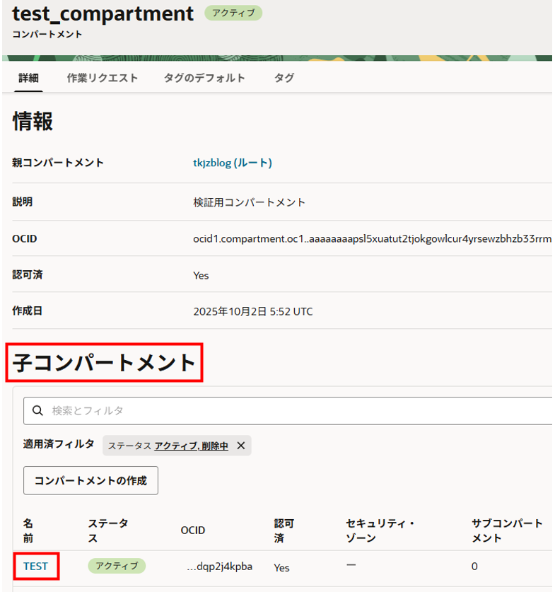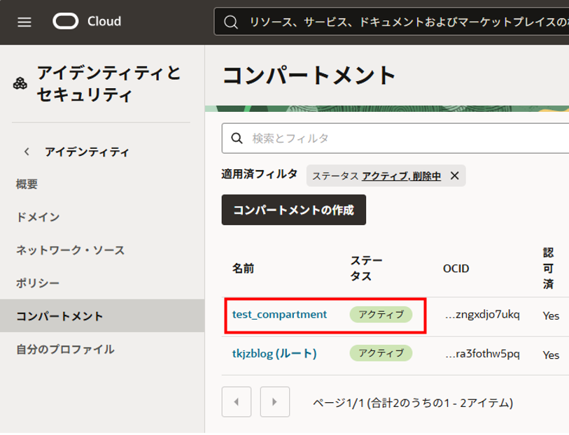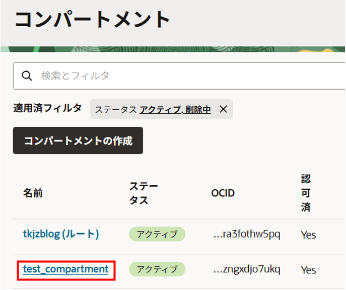 子コンパートメントを作成する際に指定した「test_compartment」をクリックします。