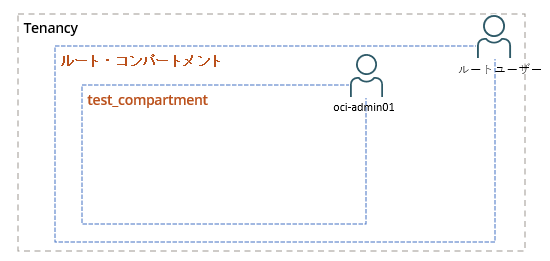 管理者ユーザー「ocitestadm01」は、管理者グループ「ociadmin_gropu」へ所属し、管理者ポリシー「ociadmin_policy」が適用されています。
