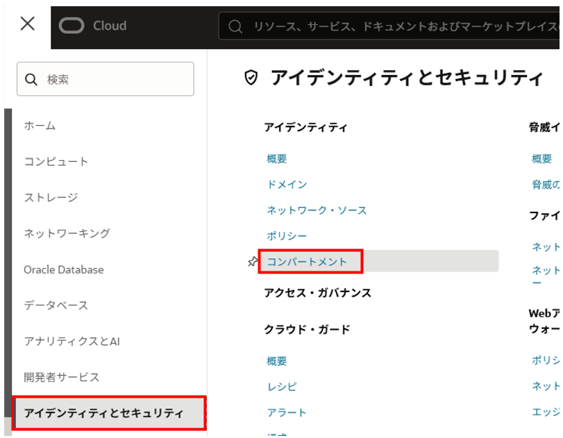 OCIコンソールの左上のハンバーガーメニューを展開し、「アイデンティティとセキュリティ」を選択、「アイデンティティ」の「コンパートメント」を選択します。