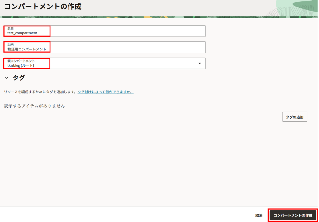 コンパートメントの作成画面で必須項目の「名前」、「説明」を入力します。