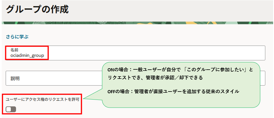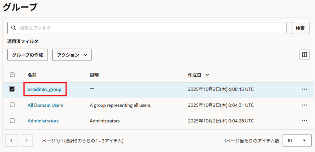 新規作成する管理者ユーザーが所属するグループとして「ociadmin_group」を作成します。