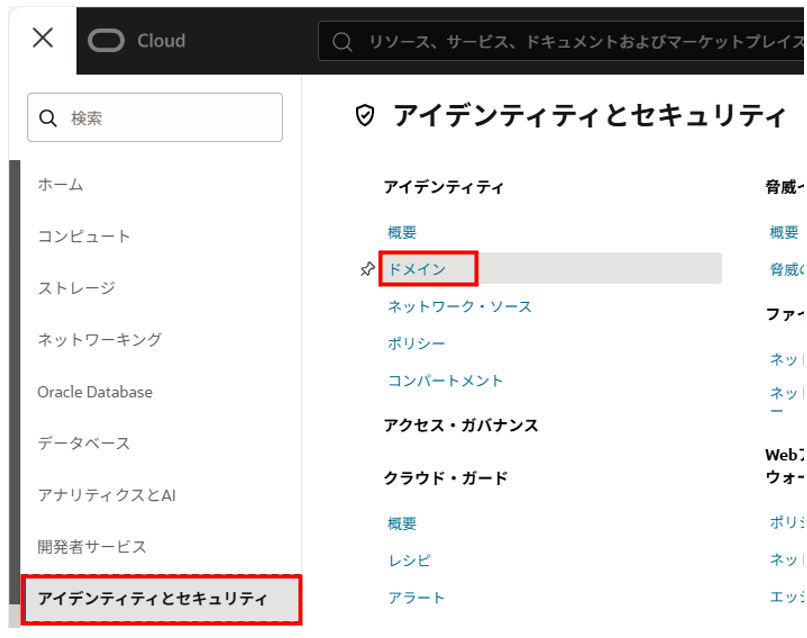 OCIコンソールの左上のハンバーガーメニューを展開し、「アイデンティティとセキュリティ」を選択、「アイデンティティ」の「ドメイン」を選択します。