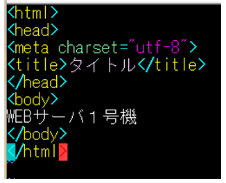 index.html ファイルを作成し、「WEBサーバ1号機」と表示されるようにします。