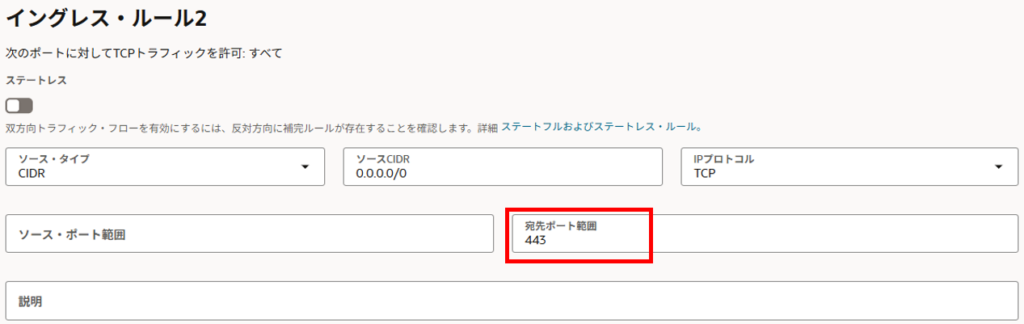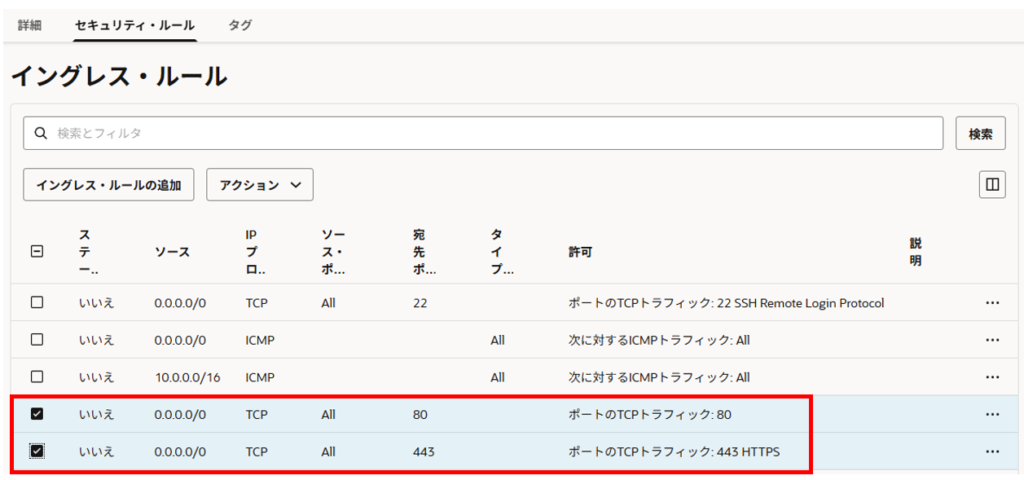 以下のとおり、80番ポート(http)と443番(https)ポートのルールを作成し、右下の「イングレス・ルールの追加」をクリックします。