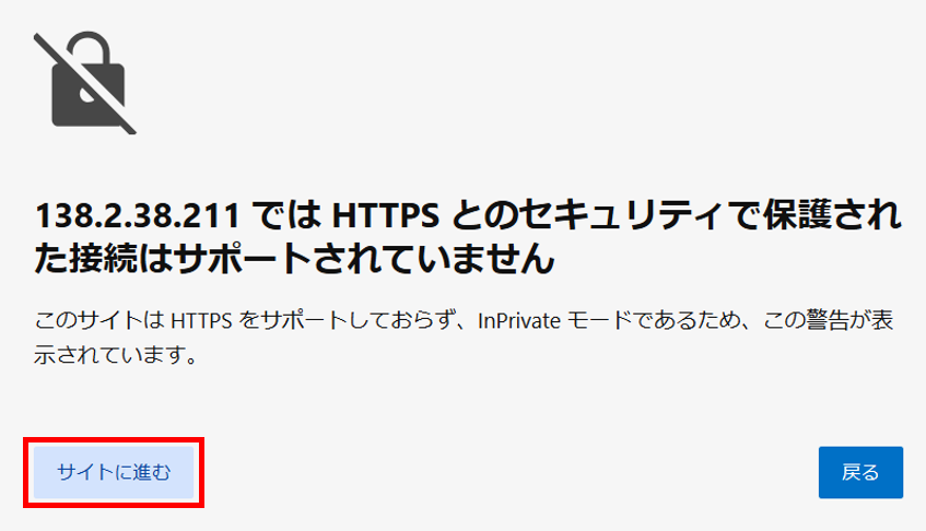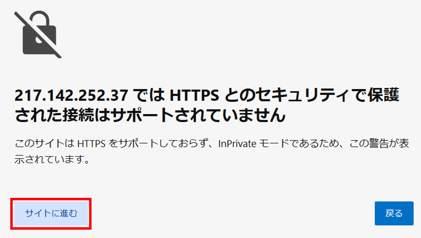 「セキュリティで保護された接続はサポートされていません」が表示されるので「サイトに進む」をクリックします。
