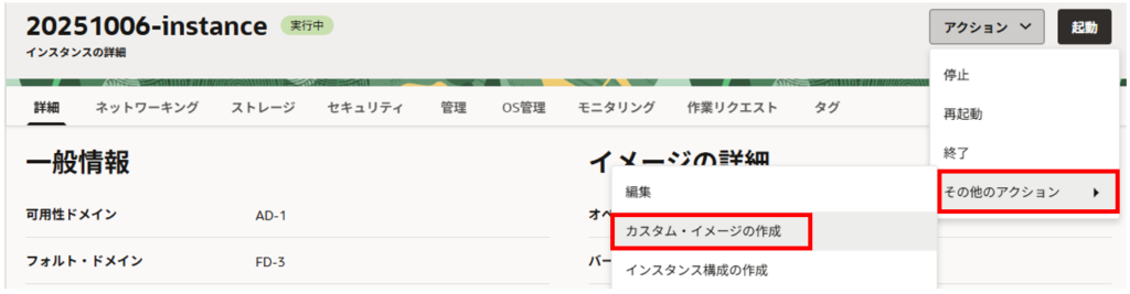 右上のアクション > その他のアクション > カスタム・イメージの作成 をクリックします。