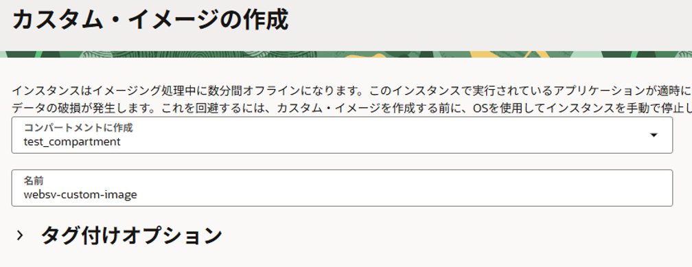 カスタム・イメージの作成画面で以下、入力、選択し、右下の「カスタム・イメージの作成」をクリックします。