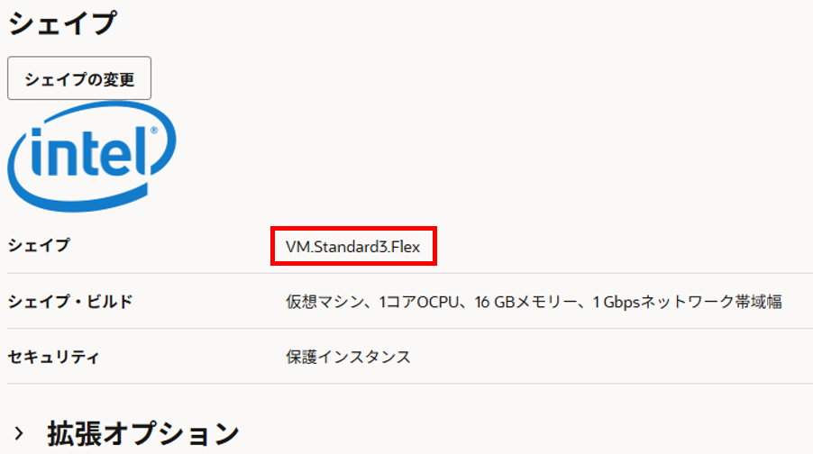 「シェイプ」は、「シェイプの変更」から「Intel」の「VM.Standard3.Flex」へ変更し、「次」をクリックします。