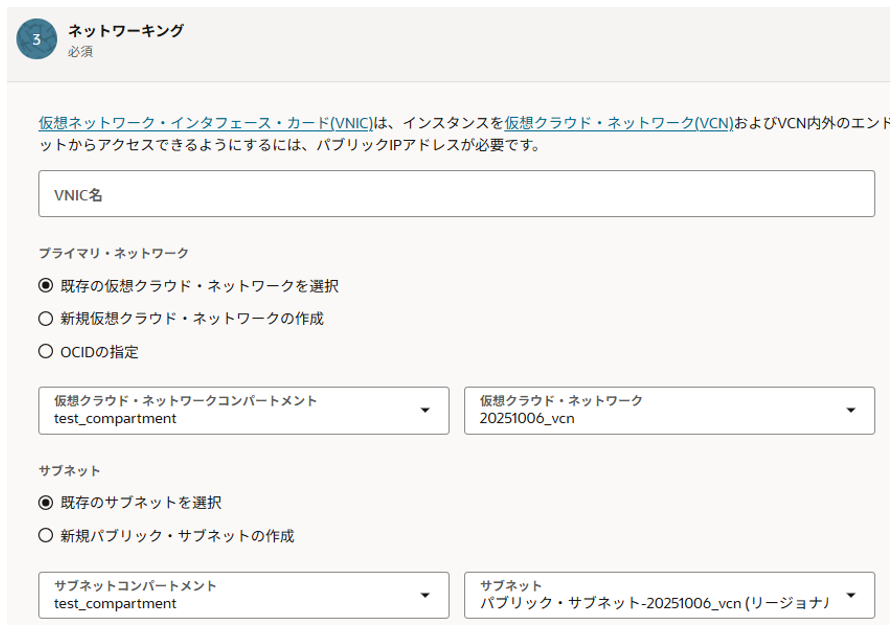 「サブネット」は、「既存のサブネットを選択」を選択し、自身の権限のあるコンパートメント、パブリック・サブネットを選択します。