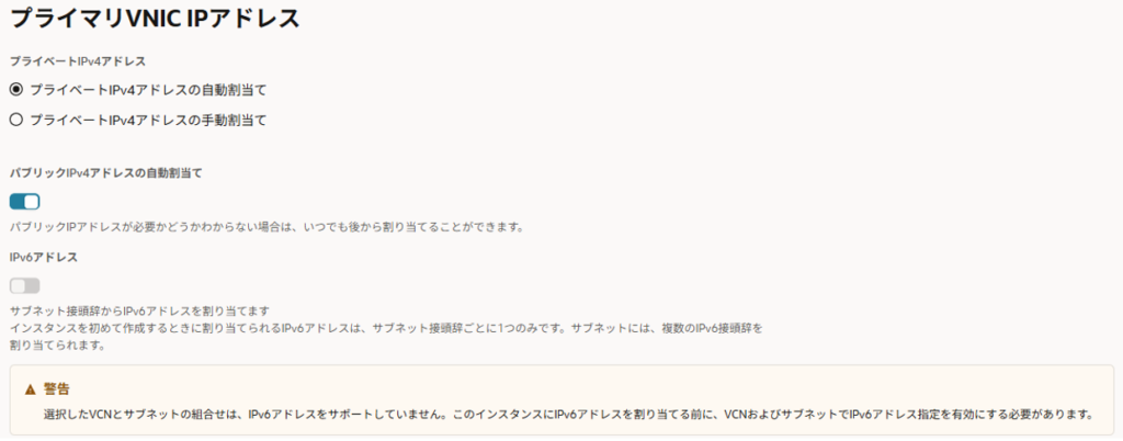「プライベートIPv4アドレス」は、「プライベートIPv4アドレスの自動割当て」を選択します。