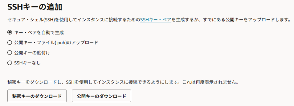 「SSHキーの追加」は、「キー・ペアを自動で生成」を選択し、「秘密キーのダウンロード」、「公開キーのダウンロード」をクリックし、ダウンロードしておきます。