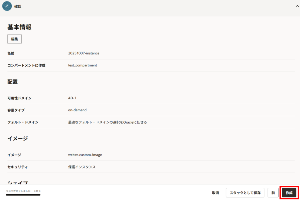 確認画面で設定内容を確認し、「作成」をクリックします。